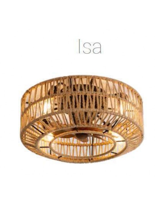 Ανεμιστήρας οροφής κατασκευασμένος από ρατάν με ξύλινα καφέ πτερύγια.