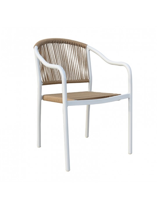 Martel πολυθρόνα αλουμινίου με σκελετό βαφής σε χρώμα white με μοντέρνο design.Η πλάτη και το κάθισμα είναι με επένδυση από συνθετικό σχοινί σε χρώμα μπέζ. Με στρογγυλεμένη πλάτη για μεγαλύτερη άνεση. Είναι στοιβαζόμενη για εύκολη αποθήκευση και κατάλληλη για εξωτερική χρήση.