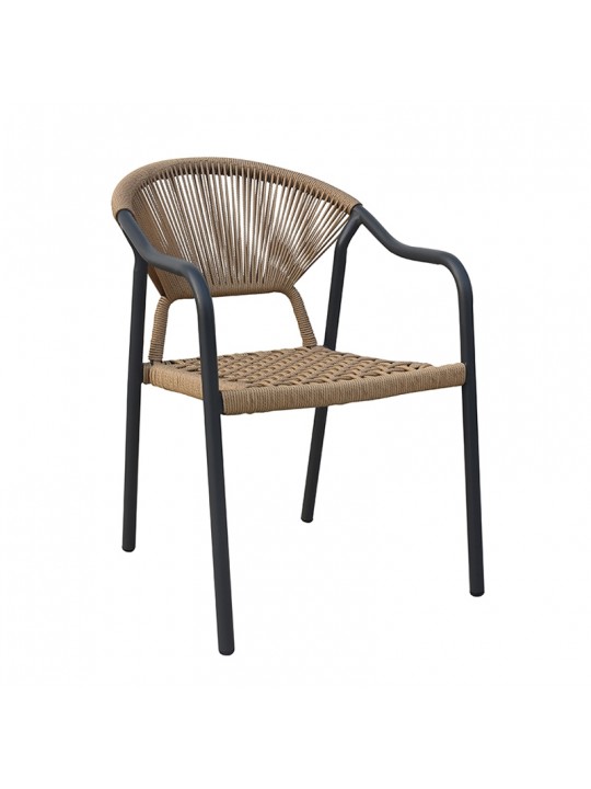 Sasta πολυθρόνα αλουμινίου με σκελετό βαφής σε χρώμα dark grey με μοντέρνο design.Η πλάτη και το κάθισμα είναι με επένδυση από συνθετικό σχοινί σε χρώμα μπέζ. Με στρογγυλεμένη πλάτη για μεγαλύτερη άνεση. Είναι στοιβαζόμενη για εύκολη αποθήκευση και κατάλληλη για εξωτερική χρήση.