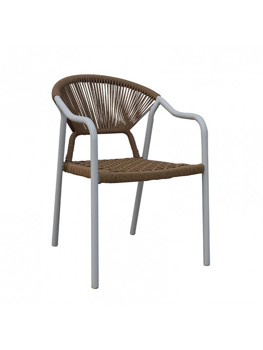 Sasta πολυθρόνα αλουμινίου με σκελετό βαφής σε χρώμα white με μοντέρνο design.Η πλάτη και το κάθισμα είναι με επένδυση από συνθετικό σχοινί σε χρώμα μπέζ. Με στρογγυλεμένη πλάτη για μεγαλύτερη άνεση. Είναι στοιβαζόμενη για εύκολη αποθήκευση και κατάλληλη για εξωτερική χρήση.