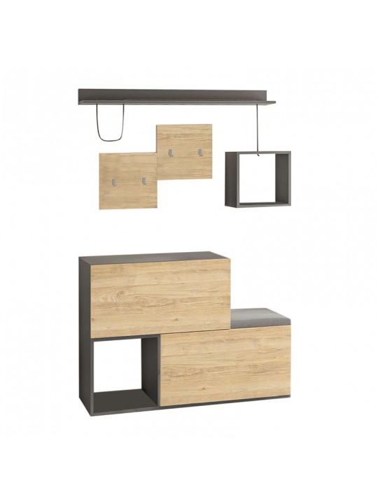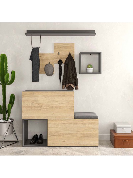 - Φέρει δύο κλειστά ντουλάπια για παπούτσια, ράφια - κουτιά για διακοσμητικά, κρεμάστρες και ένα αναπαυτικό μαξιλάρι καθίσματος σε χρώμα μαύρο.