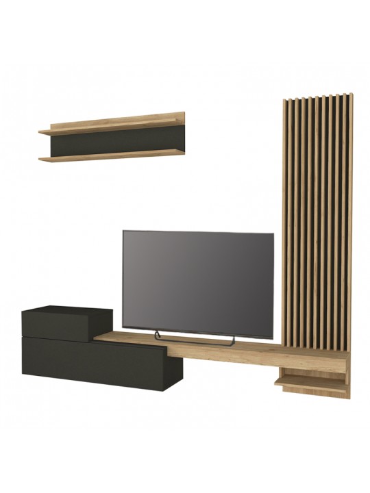 Η σύνθεση τηλεόρασης Dumont είναι ένα μοντέρνο και επιβλητικό έπιπλο με minimal design που θα αλλάξει την εικόνα του σαλονιού σας. Αποτελείται από ένα έπιπλο τηλεόρασης με ντουλάπια, μια διακοσμητική πλάτη και ένα επιτοίχιο ράφι για την προβολή των διακοσμητικών σας.