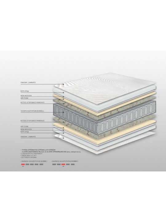 - ΤΕΛΑΡΟ ΕΛΑΤΗΡΙΩΝ BONNELL :108m2 Το κλασικό τελάρο ελατήριων φτιαγμένο από ευρωπαϊκό ανοξείδωτο ατσάλι δίνει μεγάλη αντοχή και ελαστικότητα στα στρώματα και εξασφαλίζει τη σωστή στήριξη της σπονδυλικής στήλης.