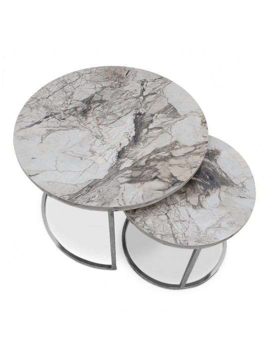 - Το σετ περιλαμβάνει δύο στρογγυλά τραπεζάκια, ένα μικρότερο κι ένα μεγαλύτερο.