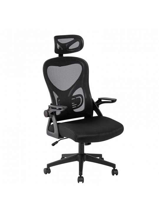 A8980 πολυθρόνα γραφείου με mesh ύφασμα στο κάθισμα μαύρου χρώματος καθώς επίσης και ανατομική πλάτη σε mesh ύφασμα χρώματος μαύρο για να αναπνέει η πλάτη.Διαθέτει προσκέφαλο για σωστή στήριξη του κεφαλιού και πτυσσόμενα μπράτσα,ρυθμιζόμενο ύψος,πλαστικό πόδι και ρόδες για εύκολη μετακίνηση.