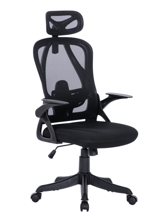 A8982 πολυθρόνα γραφείου με mesh ύφασμα στο κάθισμα μαύρου χρώματος καθώς επίσης και ανατομική πλάτη σε mesh ύφασμα χρώματος μαύρο για να αναπνέει η πλάτη.Διαθέτει προσκέφαλο για σωστή στήριξη του κεφαλιού και πτυσσόμενα μπράτσα,ρυθμιζόμενο ύψος,πλαστικό πόδι και ρόδες για εύκολη μετακίνηση.