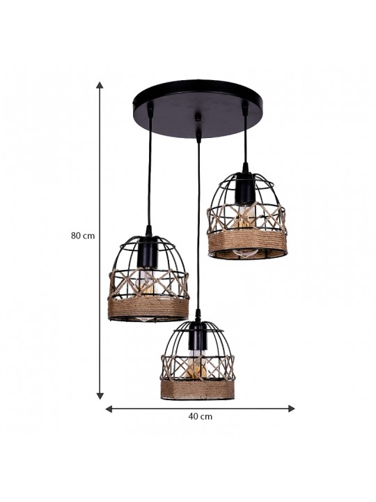 Φωτιστικό οροφής Lino Megapap E27 μεταλλικό - σχοινί τρίφωτο χρώμα μαύρο 40x40x80εκ.