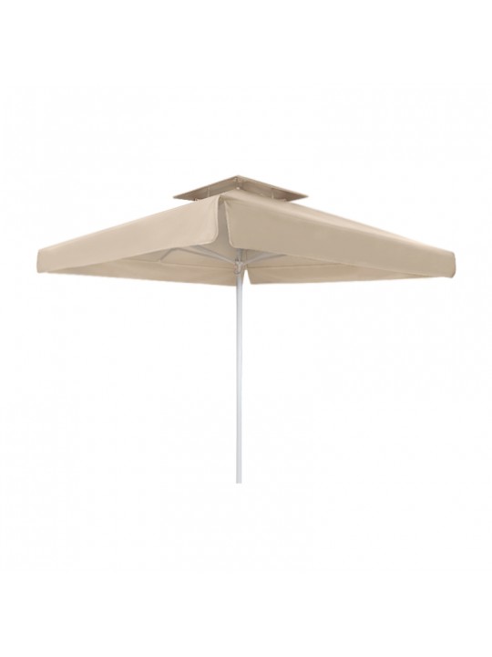 Τετράγωνη ομπρέλα αλουμινίου με τηλεσκοπικό μηχανισμό και διπλό αεραγωγό που επιτρέπει την κυκλοφορία του αέρα μειώνοντας ταυτόχρονα την πίεση του. Ιδανική επιλογή για επαγγελματική χρήση όπως beach bars, πισίνες και χώρους εστίασης.