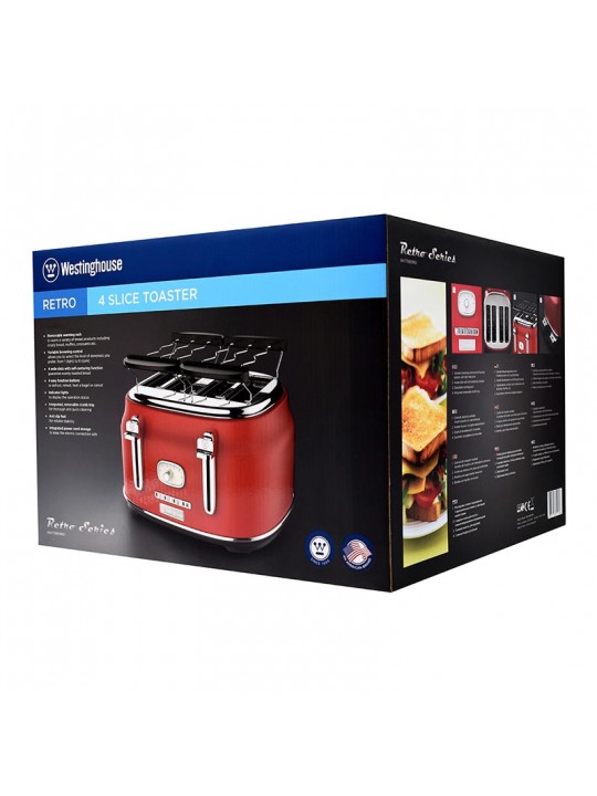 Φρυγανιέρα 4 θέσεων Retro Series από την Westinghouse! Η καταλληλότερη συσκευή για το φρυγάνισμα ψωμιού, είναι ενισχυμένη με 6 επίπεδα θερμοκρασίας και ειδική θέση για ζέσταμα κρουασάν και τσουρεκιού. Χάρη στις 4 θέσεις που διαθέτει, είναι ιδανική για την προετοιμασία πρωινού για πολλά άτομα ταυτόχρονα! Η high-end συσκευασία, συμπληρώνει το κομψό, retro design, καθιστώντας την ιδανική για την διακόσμηση κάθε κουζίνας!