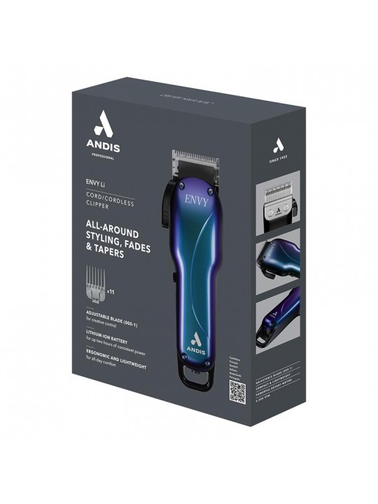 Η επαναφορτιζόμενη επαγγελματικη κουρευτική μηχανή ENVY Li της ANDIS διαθέτει περιστροφικό μοτέρ υψηλής απόδοσης, προσφέροντας 5500 κινήσεις το λεπτό για εξαιρετική αποτελεσματικότητα, ταχύτητα και ακρίβεια. Έρχεται με λεπίδες κατασκευασμένες από ανθρακούχο ατσάλι, εργονομικό σχεδιασμό και διακόπτη on/off για εύκολη χρήση. Προσφέρει πλάτος κοπής 4.5 cm, με ρυθμιζόμενο μήκος κοπής (000-1mm) και ελάχιστο μήκος κοπής 0.5mm. Περιλαμβάνει 11 χτενάκια (1.5mm, 2.4mm, 3mm, 4.5mm, 6mm, 10mm, 13mm, 16mm, 19mm, 22mm, 25mm) και επαναφορτιζόμενη μπαταρία λιθίου με χρόνο φόρτισης 90 λεπτών και αυτονομία 120 λεπτών. Επιπλέον αξεσουάρ περιλαμβάνουν 6 εναλλάξιμους αντάπτορες ρεύματος, καλώδιο φόρτισης με αντάπτορα, βουρτσάκι καθαρισμού και λάδι λίπανσης λεπίδων. Με βάρος 276g και διαστάσεις 18x6x4 cm, είναι ιδανικό για επαγγελματική χρήση.