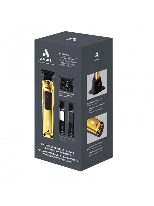Το επαγγελματικό trimmer PHENOM της Andis είναι η απόλυτη επιλογή για όσους αναζητούν επαγγελματική απόδοση με premium αισθητική. Διαθέτει Brushless μοτέρ 7.200 spm με υψηλή ροπή που διατηρεί σταθερή και δυνατή απόδοση και λεπίδες Deep-Tooth T-Blade με βαθιές αυλακώσεις για μεγαλύτερο όγκο μαλλιών. Οι λεπίδες διαθέτουν επίστρωση DLC (Diamond-Like Carbon) για υψηλή αντοχή στη φθορά, χαμηλή τριβή και ανθεκτικότητα στη διάβρωση και προσφέρουν άψογο αποτέλεσμα σε κάθε χρήση. Με ανθεκτική, εργονομική και πλήρως μεταλλική κατασκευή από αλουμίνιο και ανοξείδωτο ατσάλι για καλύτερο έλεγχο και μεγάλη διάρκεια ζωής, αλλά και επαναφορτιζόμενη μπαταρία ιόντων λιθίου, που προσφέρει τεράστια αυτονομία (έως και 4 ώρες), θα γίνει το δεξί χέρι κάθε επαγγελματία Barber και hairstylist.