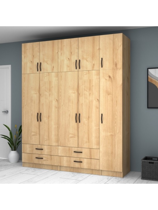 Ντουλάπα ρούχων Ricardo Megapap πεντάφυλλη με πατάρι και συρτάρια χρώμα φυσικό οξιάς 200x61,8x240εκ.