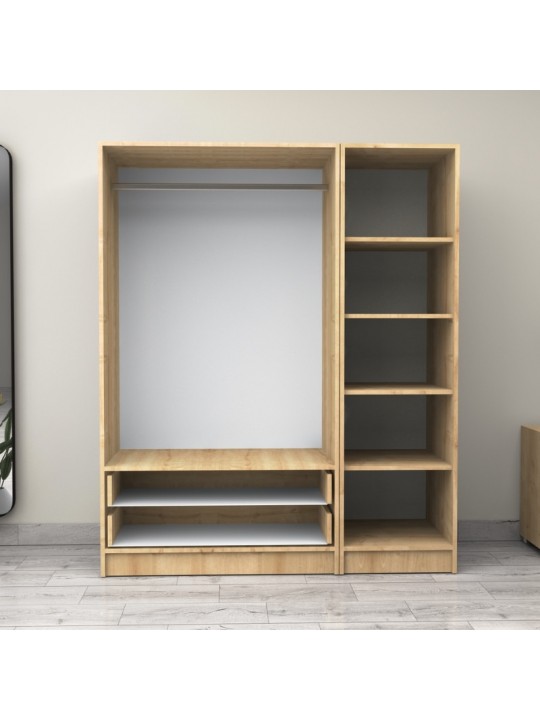 - Στο εσωτερικό της φέρει μια μεταλλική βέργα για κρεμάστρες και ράφια για μεγαλύτερη αποθήκευση. Στο κάτω μέρος φέρει δύο πρακτικά συρόμενα συρτάρια.