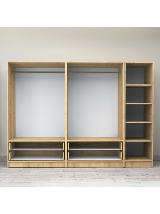 - Στο εσωτερικό της φέρει δύο μεταλλικές βέργες για κρεμάστρες και ράφια για μεγαλύτερη αποθήκευση. Στο κάτω μέρος φέρει τέσσερα πρακτικά συρόμενα συρτάρια.