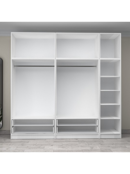 - Στο εσωτερικό της φέρει δύο μεταλλικές βέργες για κρεμάστρες και ράφια για μεγαλύτερη αποθήκευση. Στο κάτω μέρος φέρει τέσσερα πρακτικά συρόμενα συρτάρια.