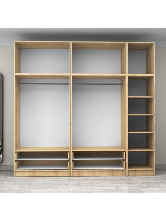 - Στο εσωτερικό της φέρει δύο μεταλλικές βέργες για κρεμάστρες και ράφια για μεγαλύτερη αποθήκευση. Στο κάτω μέρος φέρει τέσσερα πρακτικά συρόμενα συρτάρια.