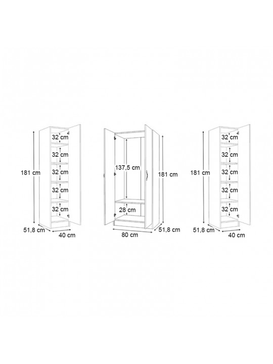 • Διαστάσεις ντουλάπας: Μήκος 80 x Βάθος 51,8 x Ύψος 181 εκ.