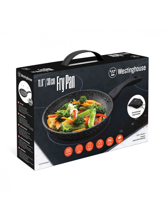 Αντικολλητικό τηγάνι (30 cm) Black Marble Series από την Westinghouse! Πρόκειται για ιδιαιτέρως χρηστικό σκεύος, καθώς ενδείκνυται για την εκτέλεση μεγάλου εύρους συνταγών, ενώ προσφέρεται για χρήση σε κάθε εστία και καθαρίζεται εύκολα στο χέρι ή στο πλυντήριο πιάτων χάρη στην διπλή αντικολλητική επίστρωση μαύρου μαρμάρου. Παράλληλα, το κομψό, high-end design του τηγανιού, σε συνδυασμό με την μοναδική συσκευασία του, το καθιστούν ιδανικό δώρο.