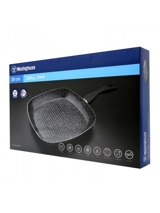 Αντικολλητική γριλιέρα (28cm) Black Marble Series από την Westinghouse! Ενισχυμένη με διπλή αντικολλητική επίστρωση μαύρου μαρμάρου, είναι κατάλληλη για χρήση σε όλες τις εστίες, και ιδίως για την εκτέλεση συνταγών για ψητά κρέατα, ψάρια και λαχανικά. Επιπλέον, καθαρίζεται εύκολα στο χέρι ή στο πλυντήριο πιάτων, ενώ το κομψό, high-end design, σε συνδυασμό με την μοναδική συσκευασία της, την καθιστούν ιδανικό δώρο.