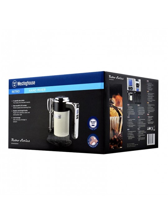 Μίξερ χειρός Retro Series από την Westinghouse! Ανθεκτική κατασκευή από ανοξείδωτο ατσάλι υψηλής ποιότητας, σε compact μέγεθος για να προσαρμόζεται άψογα σε κάθε κουζίνα. Διαθέτει 6 επιλογές ταχύτητας καλύπτοντας διαφορετικές μαγειρικές ανάγκες, όπως ανάδευση υλικών μαρέγκας, ζύμωμα ψωμιού ή ανάμειξη υλικών για κέικ, καθώς και λειτουργία Turbo. Με σύγχρονη μπλε φωτιζόμενη LCD οθόνη, που αναγράφει το επίπεδο ταχύτητας και το χρόνο λειτουργίας της συσκευής, αλλά και κουμπί Eject που επιτρέπει την εύκολη αφαίρεση των επιπλέον αξεσουάρ για γρήγορο πλύσιμο, πρόκειται για τον ιδανικό πολύ-συνεργάτη κάθε κουζίνας!