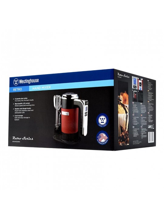 Μίξερ χειρός Retro Series από την Westinghouse! Ανθεκτική κατασκευή από ανοξείδωτο ατσάλι υψηλής ποιότητας, σε compact μέγεθος για να προσαρμόζεται άψογα σε κάθε κουζίνα. Διαθέτει 6 επιλογές ταχύτητας καλύπτοντας διαφορετικές μαγειρικές ανάγκες, όπως ανάδευση υλικών μαρέγκας, ζύμωμα ψωμιού ή ανάμειξη υλικών για κέικ, καθώς και λειτουργία Turbo. Με σύγχρονη μπλε φωτιζόμενη LCD οθόνη, που αναγράφει το επίπεδο ταχύτητας και το χρόνο λειτουργίας της συσκευής, αλλά και κουμπί Eject που επιτρέπει την εύκολη αφαίρεση των επιπλέον αξεσουάρ για γρήγορο πλύσιμο, πρόκειται για τον ιδανικό πολύ-συνεργάτη κάθε κουζίνας!