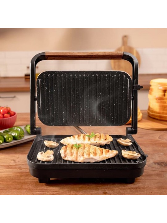 Η τοστιέρα γκριλιέρα Rock’nGrill 1300 WOOD B της Cecotec είναι ιδανική για το ψήσιμο μοσχαρίσιου κρέατος, χοιρινού, λουκάνικων, κοτόπουλου, θαλασσινών, λαχανικών, σάντουιτς και άλλων γευμάτων, προσφέροντας τέλειο αποτέλεσμα σε κάθε χρήση. Με ισχύ 1300 W και πλάκες με αντικολλητική, οικολογική επίστρωση πέτρας RockStone εξασφαλίζει εύκολο ψήσιμο χωρίς λάδι. Διαθέτει επίσης σύστημα ανάρτησης για ρύθμιση του ύψους της άνω πλάκας, αντιολισθητική βάση για μεγαλύτερη σταθερότητα κατά τη λειτουργία και κλείδωμα ασφαλείας.