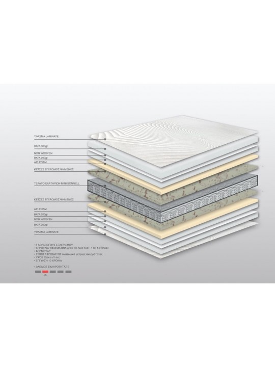 • ΤΕΛΑΡΟ ΕΛΑΤΗΡΙΩΝ MINI BONNELL (268 ελατήρια ανά τετραγωνικό) : Τελάρο ελατήριων φτιαγμένο από ευρωπαϊκό ανοξείδωτο ατσάλι δίνει μεγάλη αντοχή στα στρώματα. Τα ελατήρια Mini bonnell έχουν μικρότερη διάμετρο από τα κλασικά Bonnell με αποτέλεσμα να έχουν καλύτερη εφαρμογή στο σώμα και ελαστικότητα.