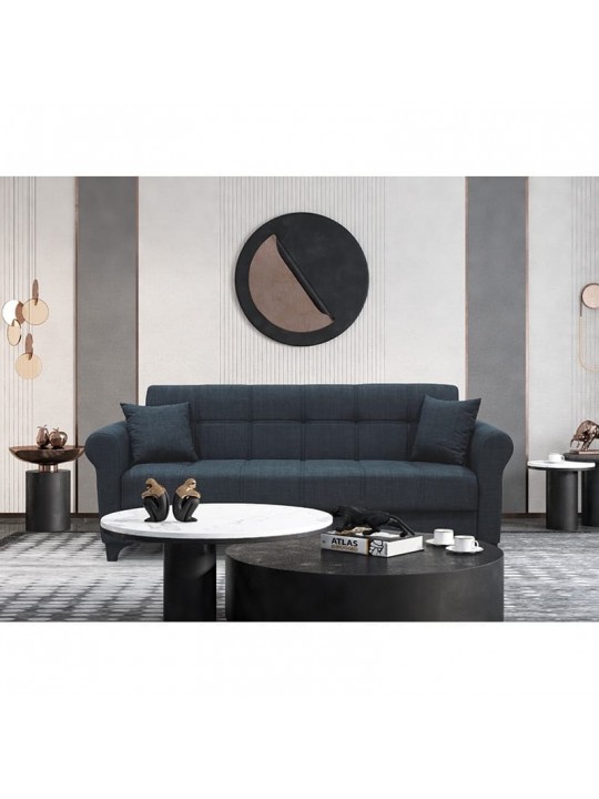 Azur τριθέσιος καναπές/κρεβάτι με καπιτονέ ύφασμα σε χρώμα grey και ιδιαίτερο σχεδιασμό στα μπράτσα. Ένας διαχρονικός καναπές που προσφέρει πρακτικότητα και άνεση, γίνεται εύκολα κρεβάτι για κάθε περίπτωση που θα χρειαστείτε ένα επιπλέον κρεβάτι στο σπίτι σας. Ο εσωτερικός ελεύθερος χώρος που διαθέτει κάτω από το κάθισμα προσφέρεται για να αποθηκεύσετε τα κλινοσκεπάσματα για το κρεβάτι, τα επιπλέον διακοσμητικά σας μαξιλάρια ή οτιδήποτε άλλο επιθυμείτε.